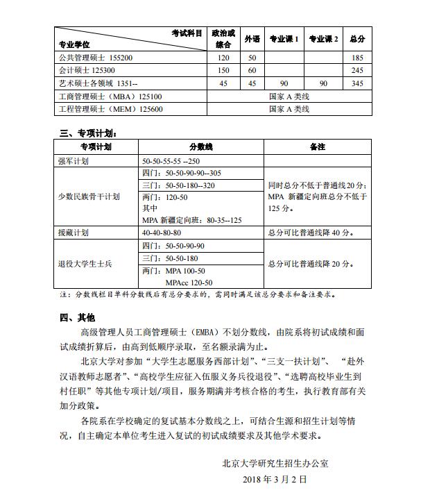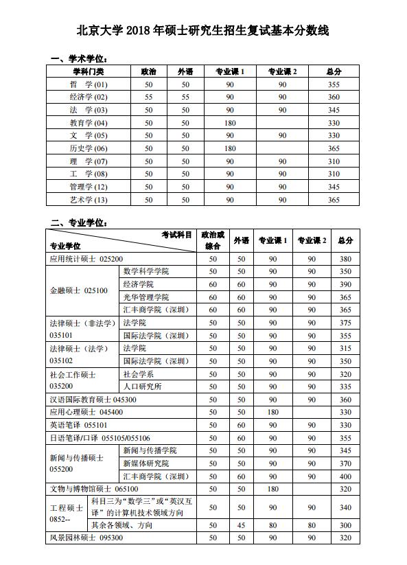 北京大学2018年硕士研究生招生复试基本分数线如下: