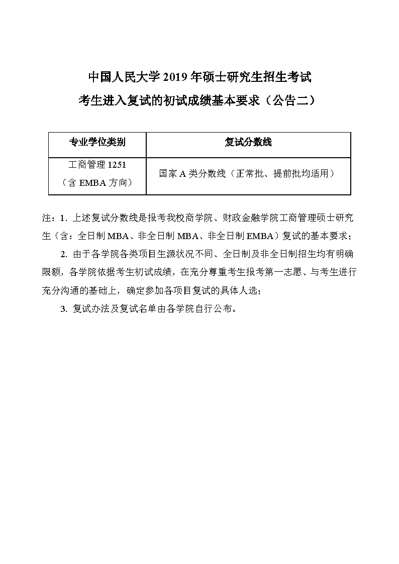 中国人民大学2019年硕士生招生考试进入复试的初试成绩基本要求