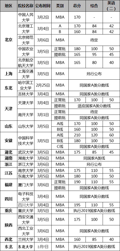 2019年全国34所MBA自主划线院校复试线汇总院校动态
