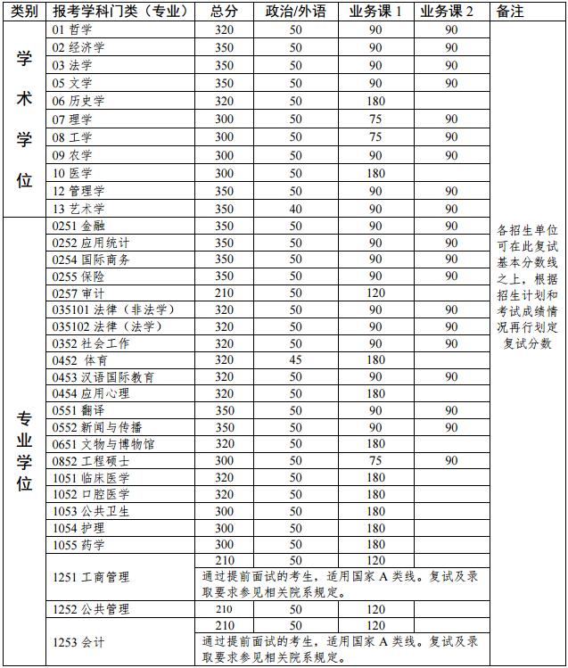 中山大学2019年硕士研究生招生考试复试基本分数线