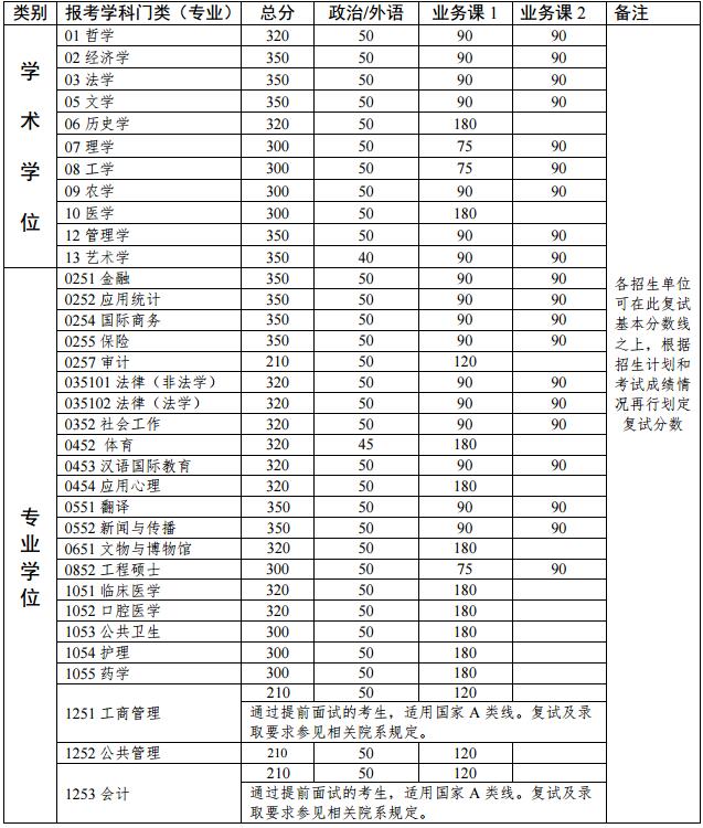 中山大学2019年硕士研究生入学考试复试基本分数线