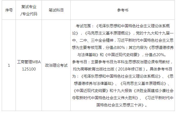 加试政治理论课考试。根据教育部关于印发《2019年全国硕士研究生招生工作管理规定》的通知(教学〔2018〕5号)文件规定:工商管理、公共管理、旅游管理、工程管理、会计、图书情报、审计专业学位硕士思想政治理论考试由招生单位在复试中进行。工商管理(MBA)考生需加试的思想政治理论为笔试,考试时间2小时,开卷考试,满分100分,不计入复试总成绩比例计算中,但必须达到合格要求方能录取(合格成绩线待考试结束成绩评定出来后根据总体情况划定)。