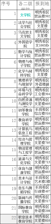参加复试的考生于3月28日下午14:30到指定地点报到、提交资格审查材料。笔试和面试地点见《南宁师范大学2019全日制硕士研究生复试安排》(27日见本网公布)。各二级学院报到地点如下: